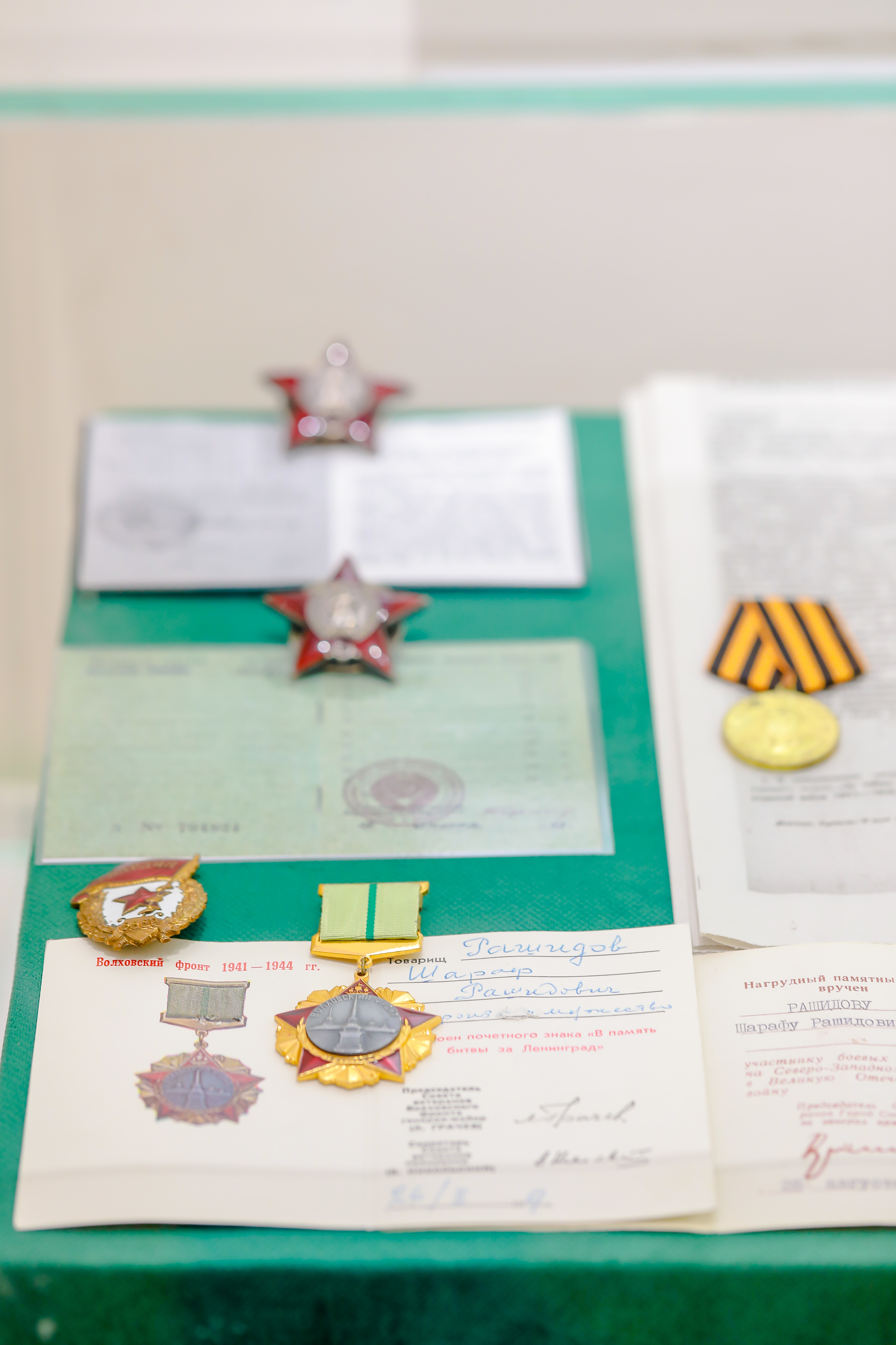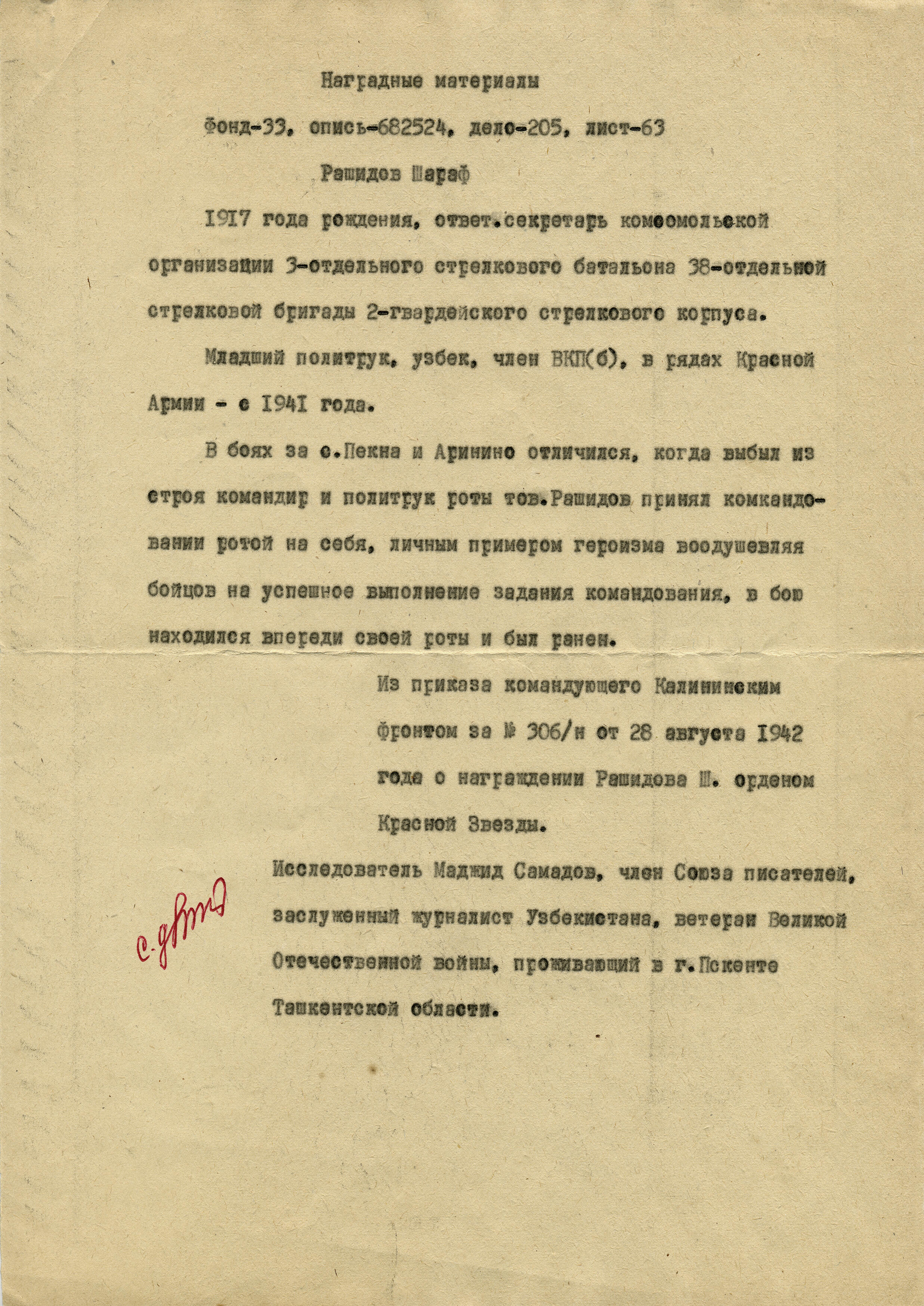 За мужество в боях под Москвой и за освобождение Ленинграда он был награжден орденом Красной Звезды. «В боях за села Пена и Аринино, когда выбыл из строя командир, политрук роты товарищ Рашидов принял командование ротой на себя, личным примером героизма воодушевляя бойцов на успешное выполнение командования, в бою находился впереди своей роты и и был ранен», — документ из архива Минобороны СССР.